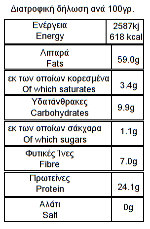 Περιέχει ω3 λιπαρά οξέα, βιταμίνη Ε, καθώς και ποσότητες ασβεστίου, μαγνησίου, σιδήρου και ψευδαργύρου. Είναι επίσης πλούσια σε φυτικές ίνες όπως ιχνοστοιχεία, αντιοξειδωτικά και βιταμίνες που βοηθούν στη διατήρηση της υγείας του ανθρώπινου οργανισμού.
